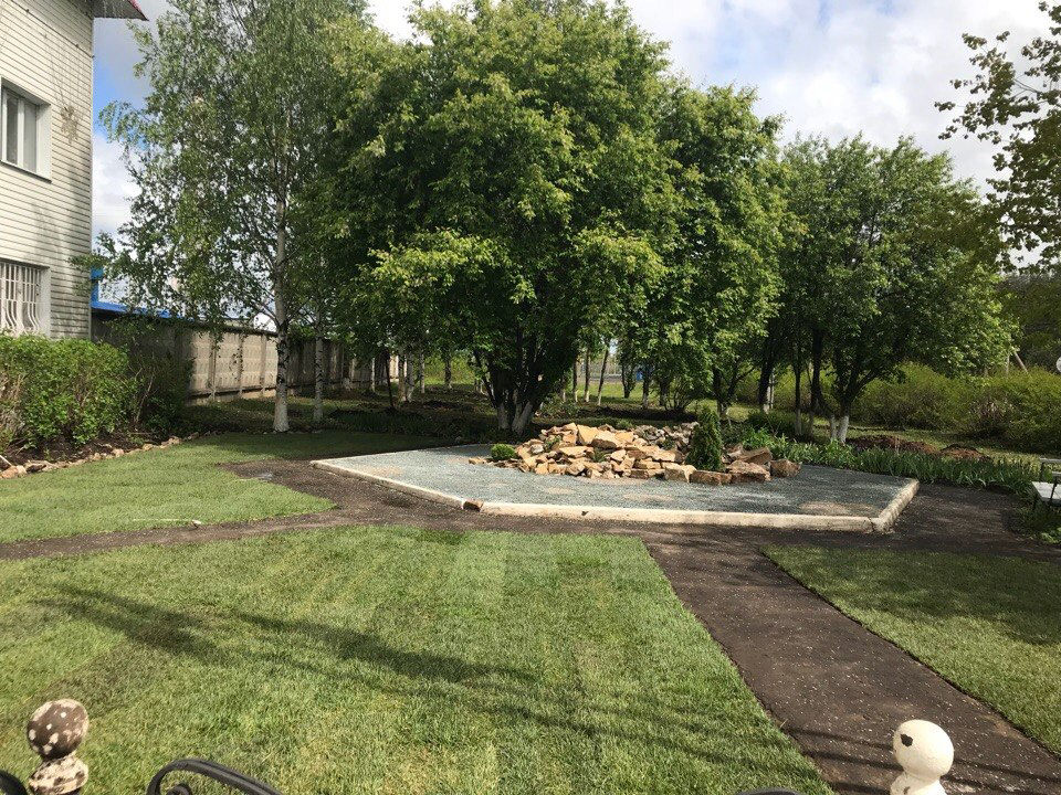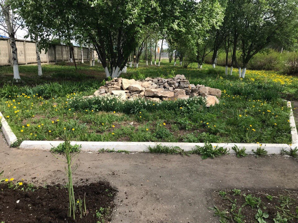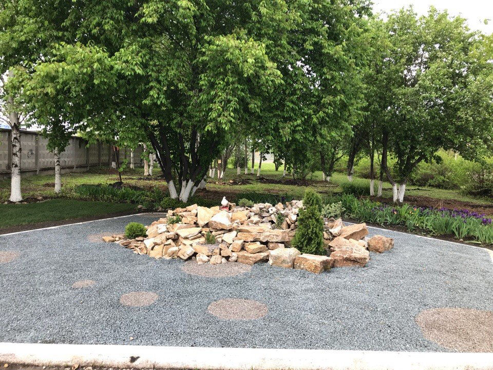 4. Укладка камня в альпийскую горку из имеющейся кучи камней, посадка растений, отсыпка щебнем двух цветов в виде узора